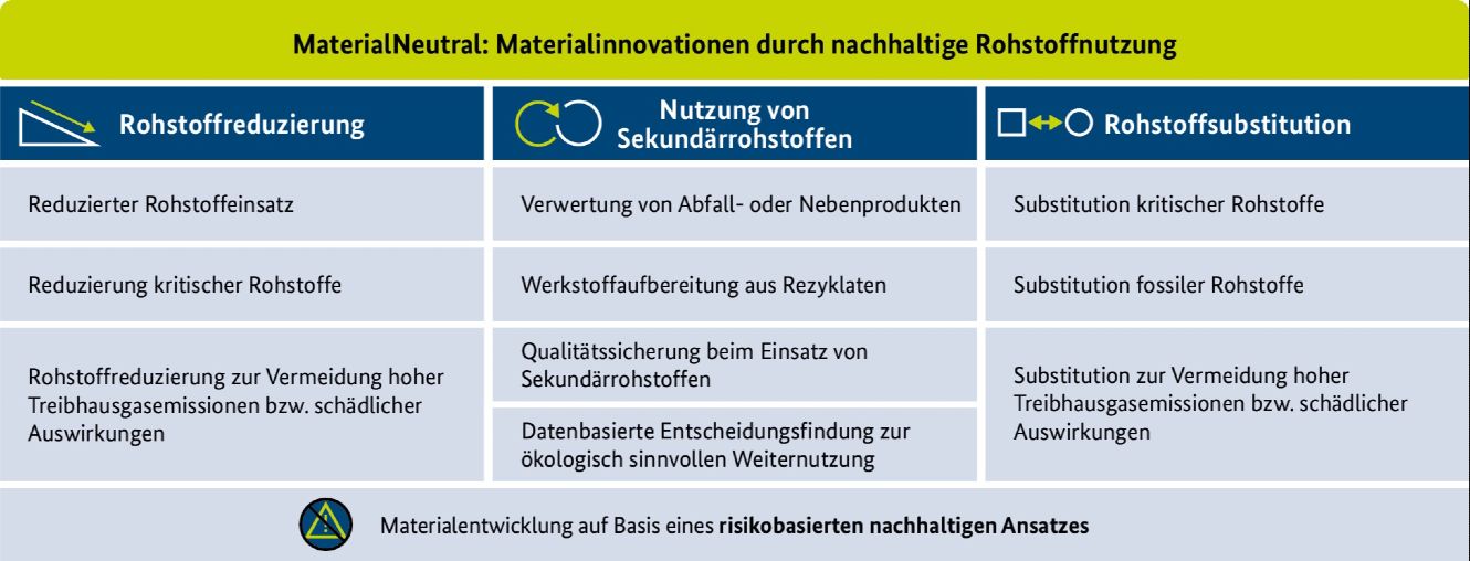Forschungsverbünde in Modul 2 "Materialinnovationen durch nachhaltige Rohstoffnutzung" (2025 – 2029) haben sich zum Ziel gesetzt den Einsatz von Primärrohstoffen zu reduzieren, die Abhängigkeit von kritischen Rohstoffen zu verringern und die Treibhausgasemissionen bei der Materialherstellung zu senken. Gleichzeitig sollen negative Auswirkungen auf Mensch und Umwelt minimiert werden.